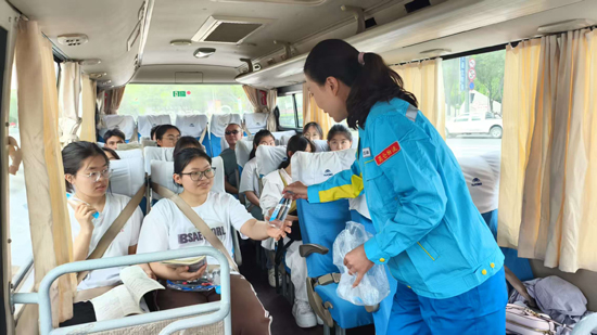 图为员工在送考车上为考生发放矿泉水。贺丽娅 摄